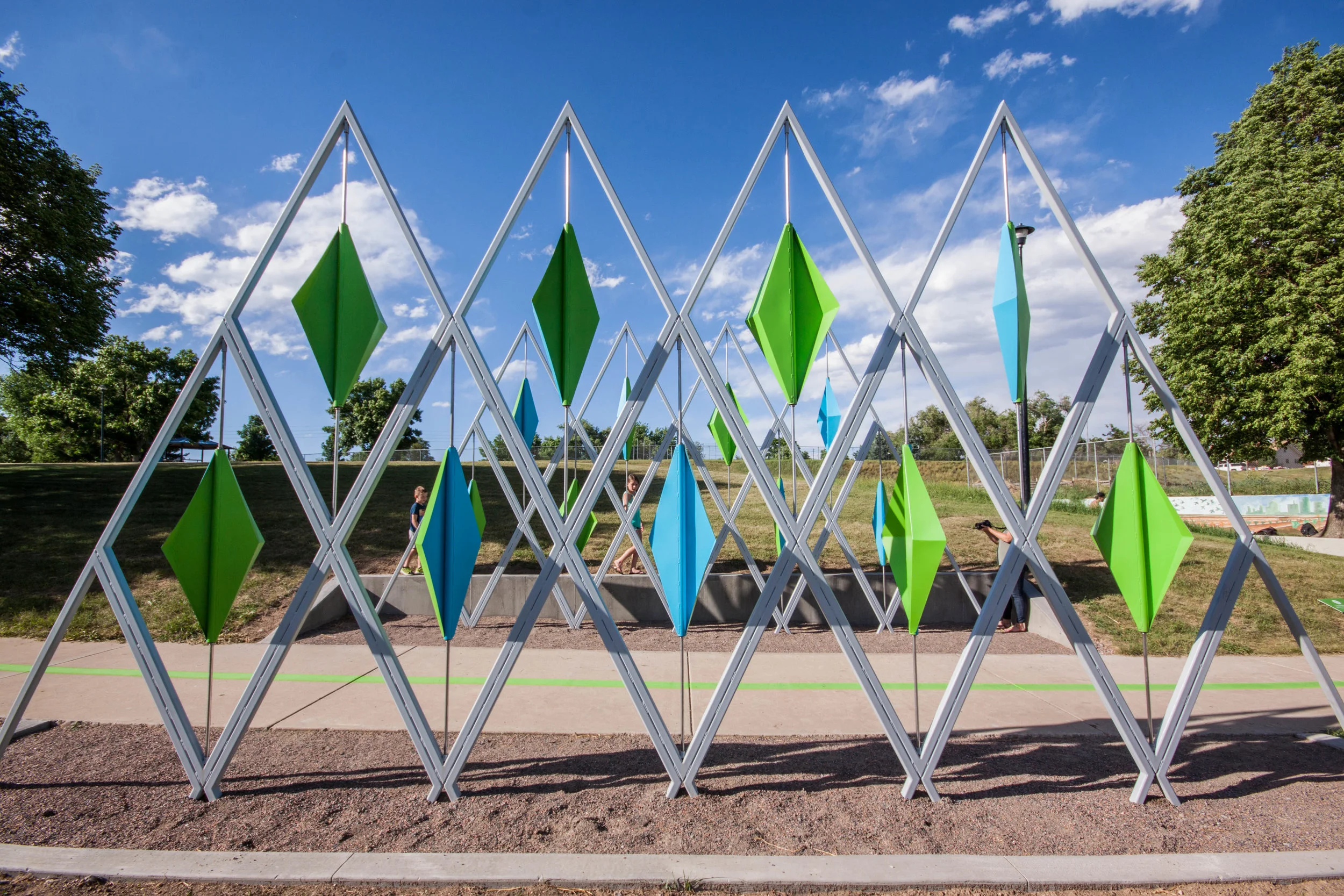 PUNCH was selected to design three iconic sculptures for the 40 West ArtLine in Lakewood, CO. We designed three sculptures based on the Stegosaurus, Colorado's state dinosaur. The sculptures were built by Colorado based company IDSculpt. The first sculpture is Dermalplate Gateway, a kinetic sculpture with stegosaurus dermal fins that spin in the wind. Stegoskel is the second sculpture, fabricated out of a weathered steel exo skeleton based on a stegosaurus's internal structure with ipe wood seating. The third sculpture is Unearthed, a playful sculpture of sculpted GRFC fins that slightly come out of the ground, like a gentle giant slowly coming out of the earth.